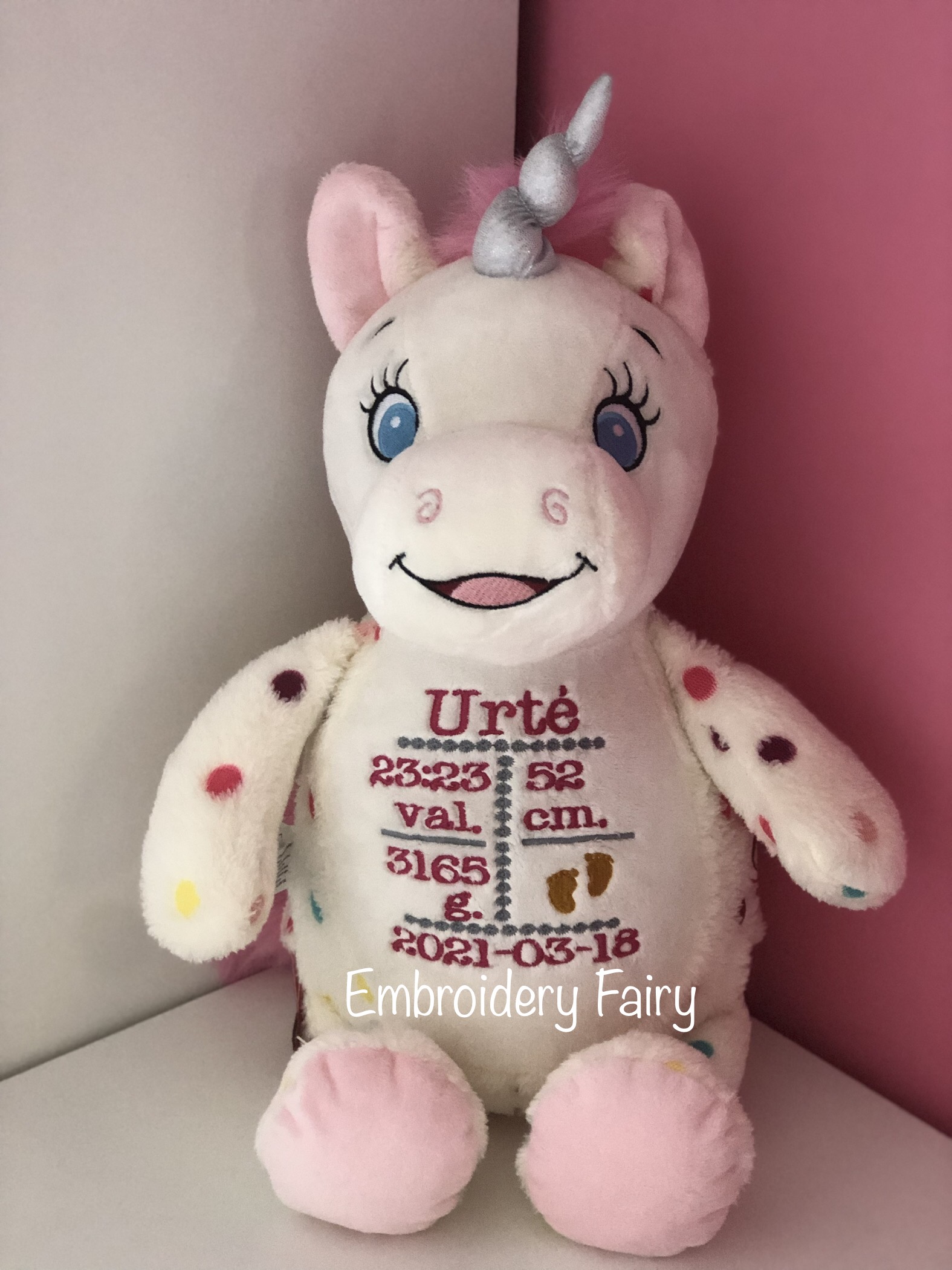 Žaislas apie 30 cm aukščio (pasodintas). Gali būti išsiuvinėtas metrikas, palinkėjimas ar bet koks kitas pageidaujamas tekstas norima spalva.