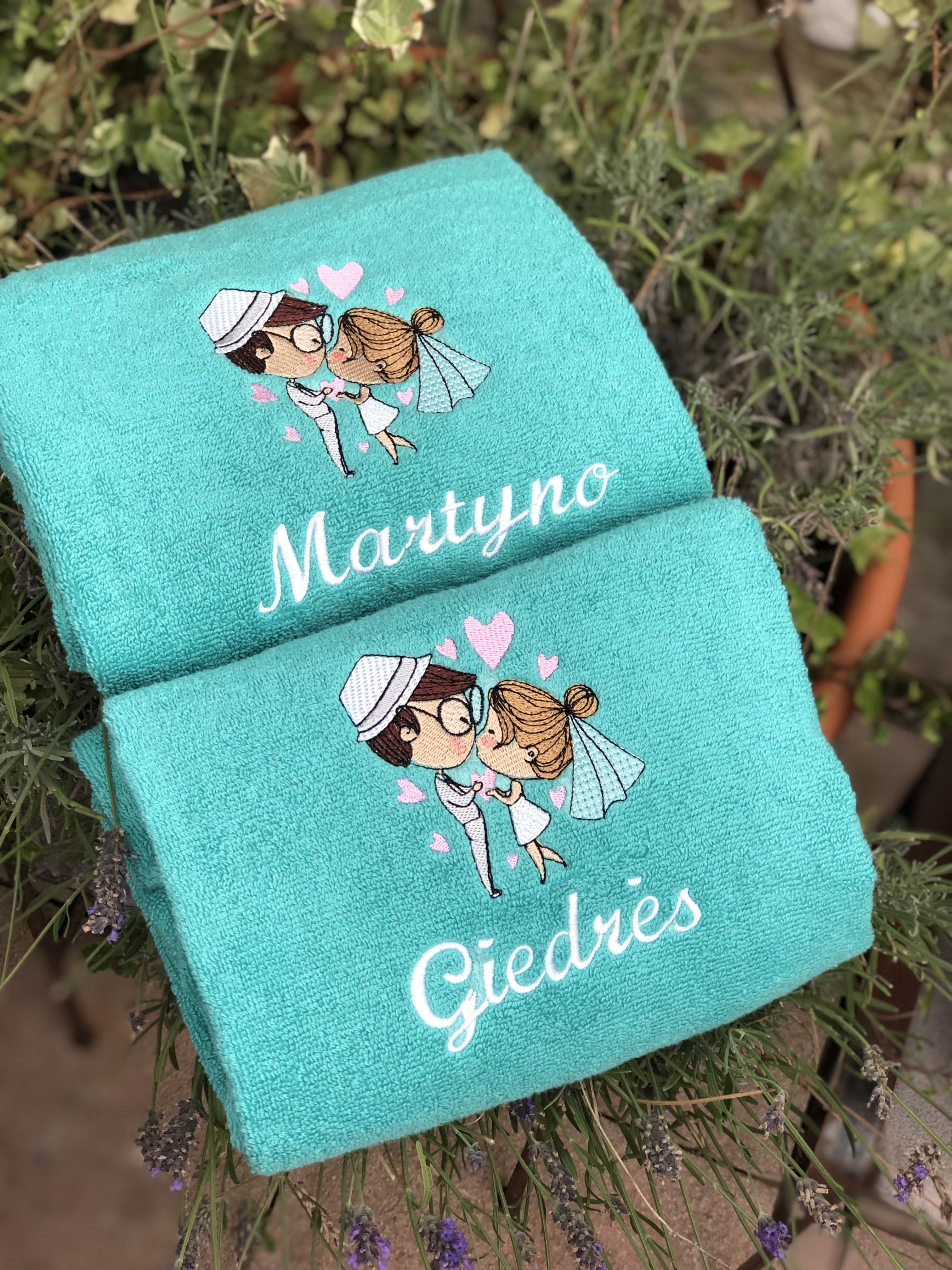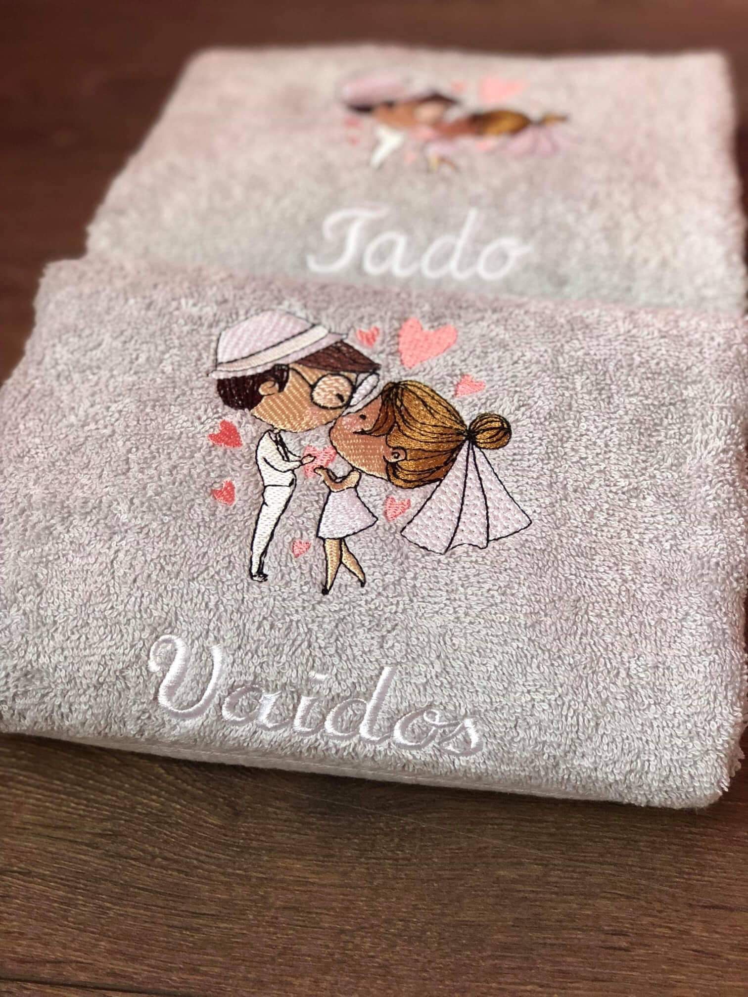Nurodyta kaina yra už vieną vienetą, tad jei norite dovanos abiems jauniesiems, į krepšelį turėtumėte įsidėti 2 vnt. Siuvinėta dalis maždaug 17x 17 cm. 100% medvilnė, neplonesnis nei 380 g/m2.